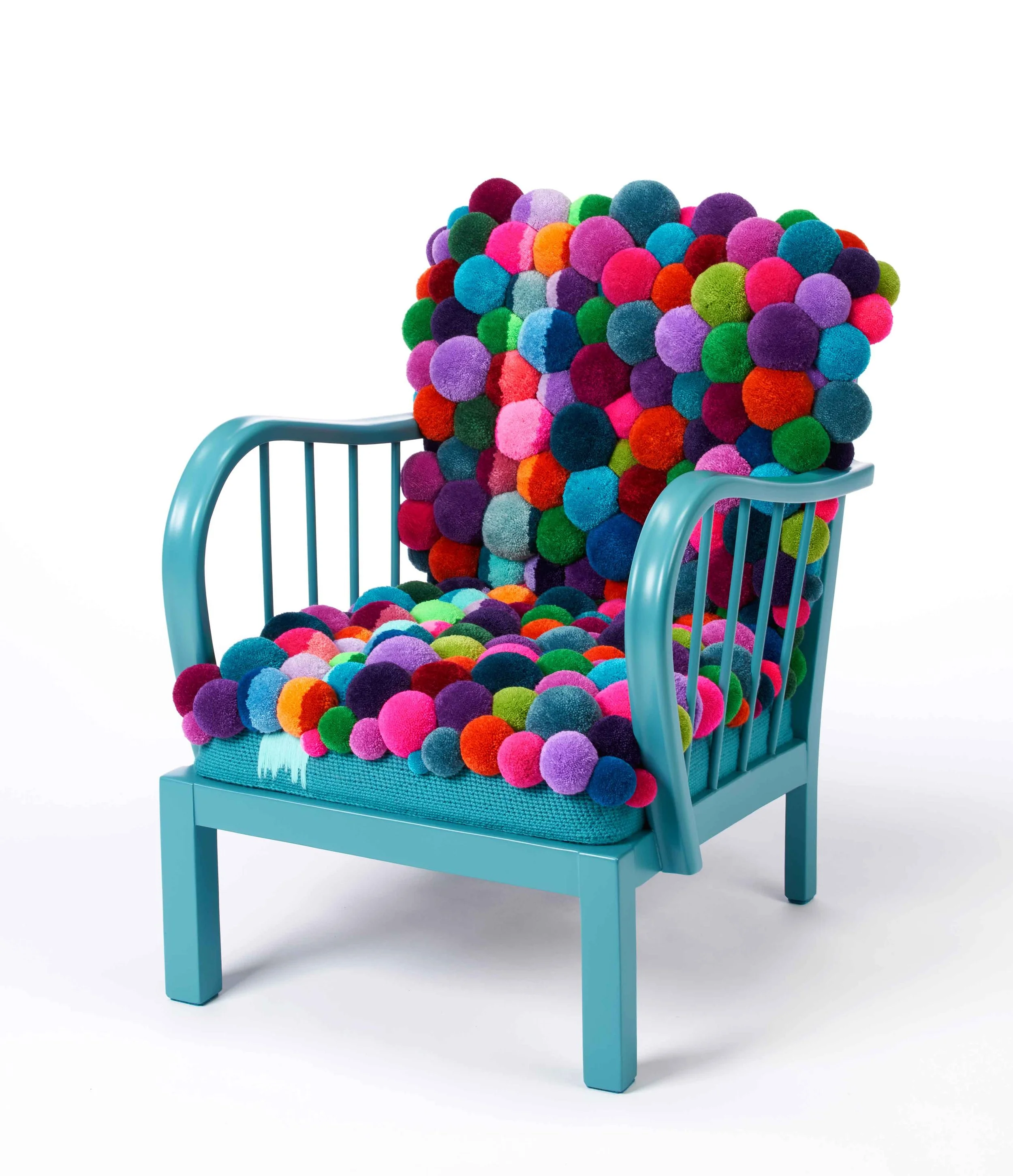 This armchair is a refurbished old wooden chair. It has an upholstery with over 250 handmade wool pompons from multicolor. They are knotted to a dense surface and cover the seating area and the backrest cushion. The bleached stripe is imitated by a two-tone color pattern which has been bundled into the pompons. A hand embroidery follows up the stripe in the backrest and into the crocheted side of the seating. All used materials are of high quality. This design object is exclusively handmade in Germany and at MYKs studio in Berlin. Customizing in color is possible.