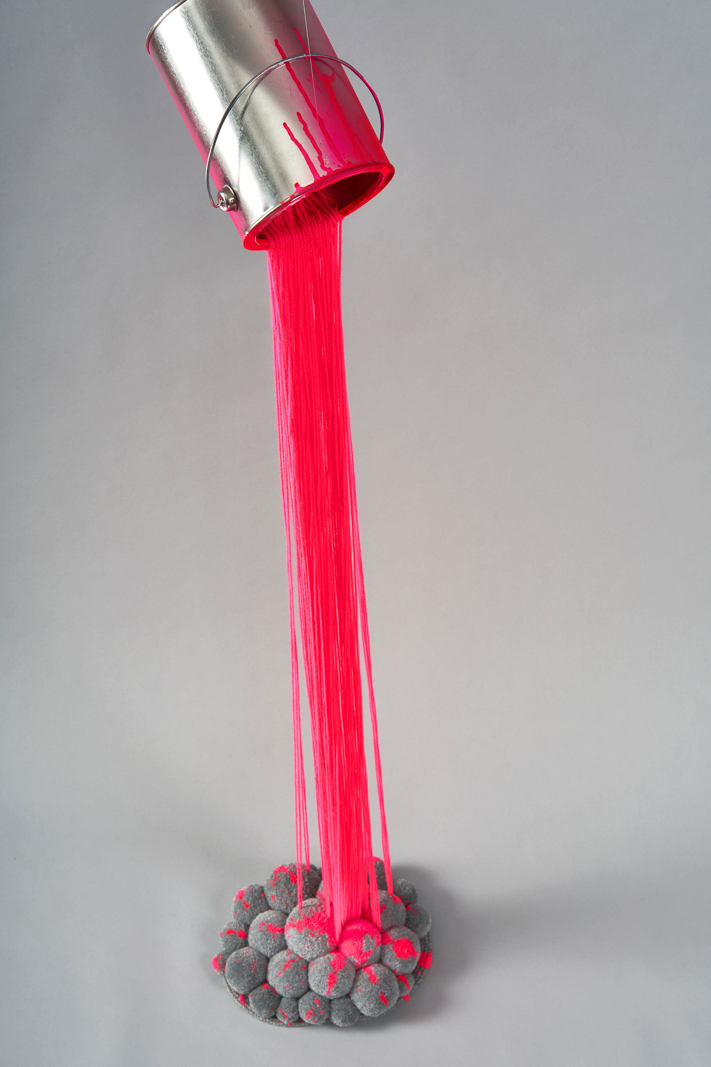 Myra von Busekist and her team sometimes work on the edge of legality: "We often have to overcome the barriers of the construction sites at considerable (criminal) expense in order to place an object correctly. Then the wind direction has to be good, and my partner (the Amazonian Indian Equi) shoots his blowpipe arrows - don't worry: they are blunt and not poisoned - at the right moment. Not always do the unbalanced painters spill a whole bucket of paint, sometimes they drop something else or the pompon object is not hit. That means then, everything again from the very beginning..."